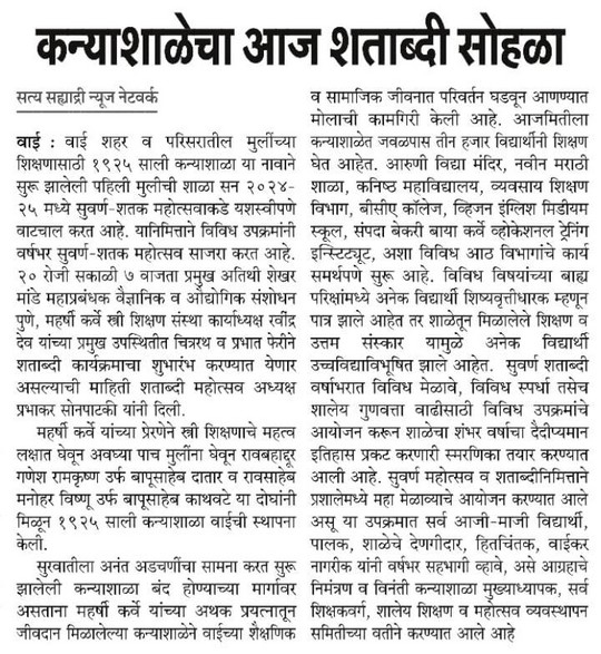 जून २०२४ रोजी उद्घाटन झालेल्या या शताब्दी महोत्सवाची गुरवार दिनांक १९ जून २०२५ रोजी सांगता करण्यात आली. प्रमुख पाहुणे मा. सौ मेधा कुलकर्णी यांचे संस्थेच्यावतीने व प्रशालेच्या वतीने ढोल ताशांच्या गजरात स्वागत करण्यात आले. महर्षी अण्णांच्या पुतळ्यास पुष्पहार अर्पण करण्यात आला.