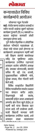 दिनांक २० जून २०२४ रोजी सकाळी दहा वाजता कन्याशाळा वाई शताब्दी महोत्सव व नवीन मराठी शाळा सुवर्ण महोत्सवाचा उद्घाटन सोहळा सत्यवती जोशी सभागृहात मोठ्या दिमाखात संपन्न झाला सभागृहातील कार्यक्रमापूर्वी सकाळी साडेआठ वाजता ढोल ताशांच्या गजरात तुतारीच्या निनादात कन्याशाळेतून शोभायात्रा निघाली. या शोभायात्रेसाठी महोत्सवाचे अध्यक्ष, सचिव, कार्याध्यक्ष, उपकार्याध्यक्ष, मुख्याध्यापक, आजन्मसेवक, शाला समिती सदस्य, पालक, विद्यार्थिनी, शिक्षक व शिक्षकेतर कर्मचारी उपस्थित होते